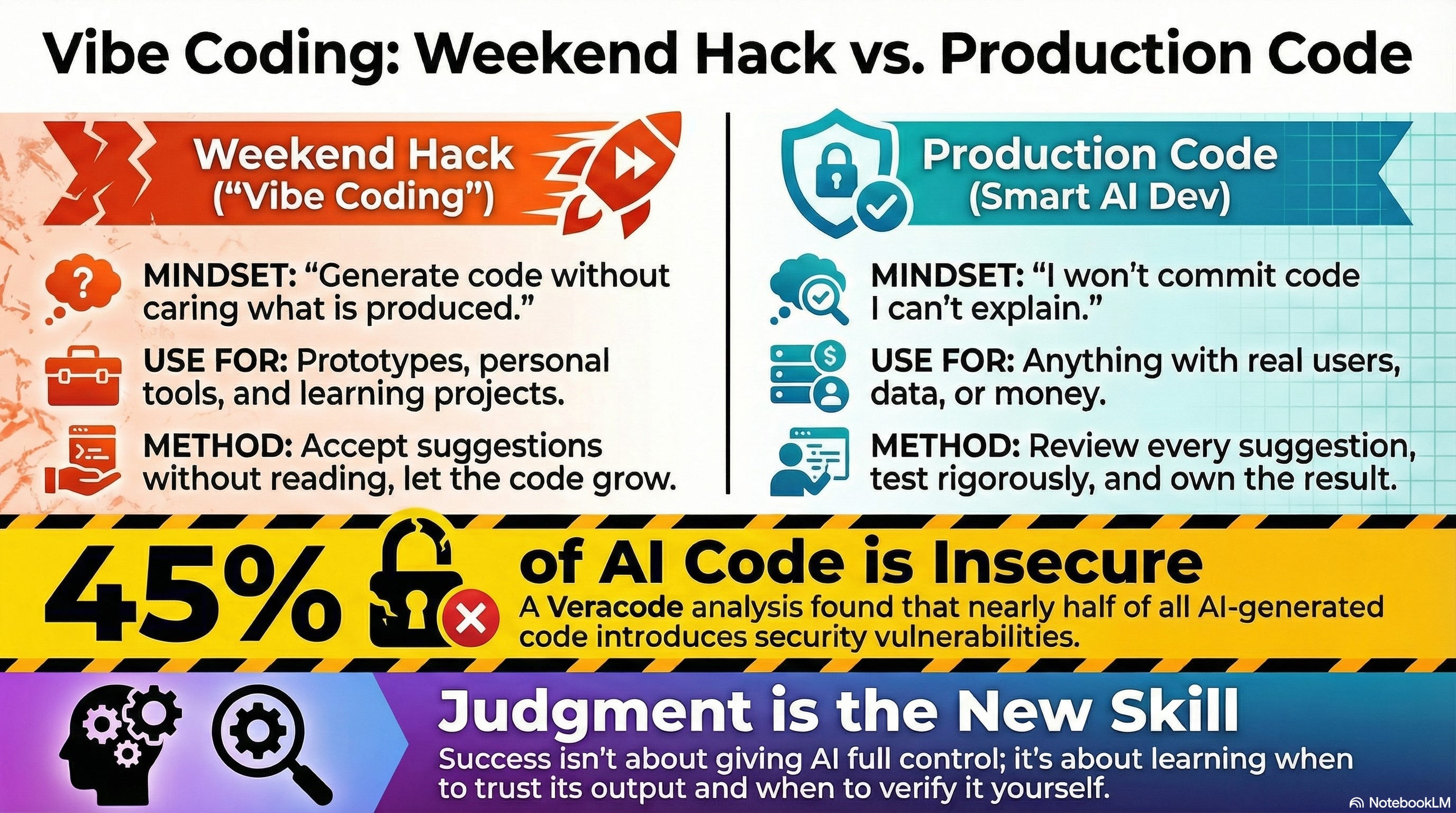 If you’ve reviewed everything, tested it, and can explain what it does? That’s not vibe coding—that’s software development with better tools. If you’re accepting suggestions without reading them and hoping it works? That’s the approach Karpathy reserved for throwaway projects.
